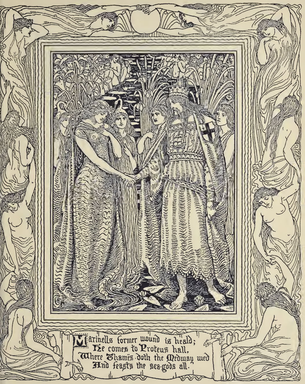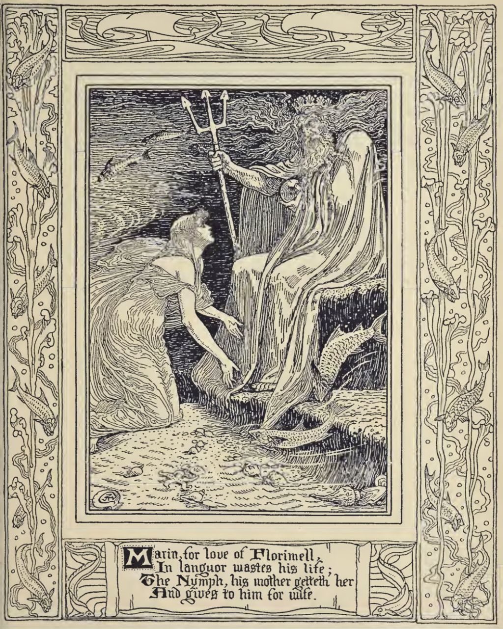Marinell’s mother pleads her son’s case to Neptune himself, and convinces him to issue an order to Proteus to release his captive. Florimell is then united with Marinell, and they declare their mutual love.