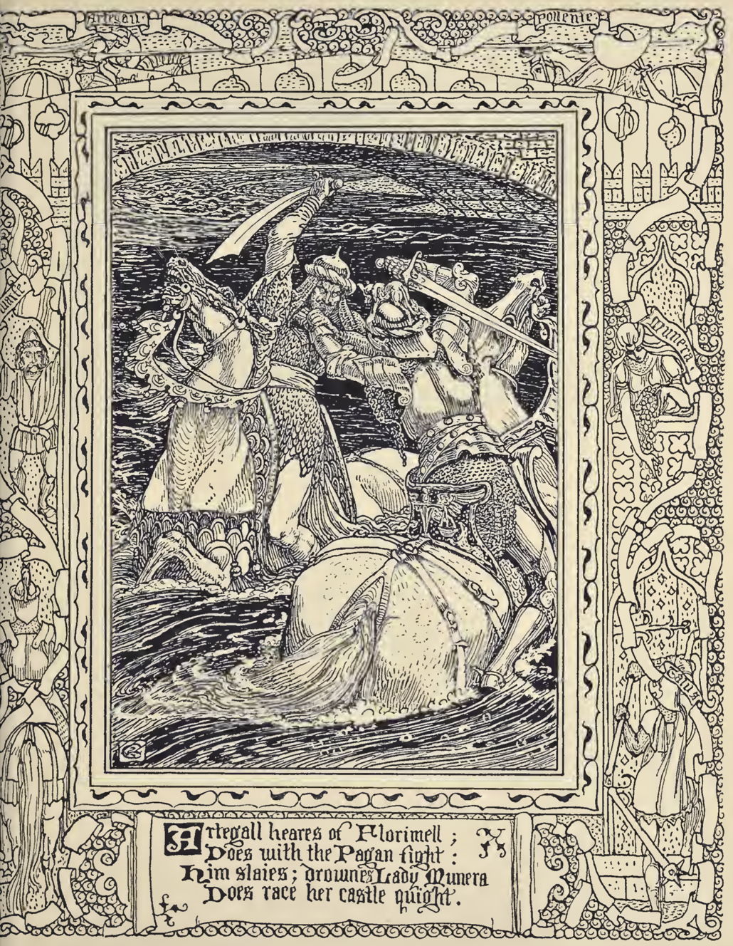 When Artegall reaches the bridge, Pollente demands his extortionate toll. The knight charges at him, his lance ready, and when the trapdoor is released he leaps down into the river rather than falling. As soon as the Saracen joins him, Artegall attacks him violently, beating the water to foam in his frenzy. As the Saracen starts to weaken and gasp for air, he climbs out of the water and tries to run away. Artegall catches him and with one stroke of his sword Chrysaor beheads him, letting his body tumble back into the river.
