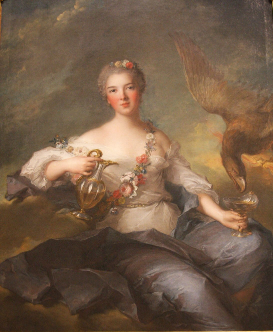 Jean-Marc Nattier’s portrait of the Duchesse de Chartres (1726-1759) as Hebe, which he painted in 1744, is one of three portraits of nobility and royalty whom he placed in the role of Hebe. This shows Louise Henriette de Bourbon, who was later to become Duchesse d’Orléans. With her are the familiar cup and Zeus as an eagle.