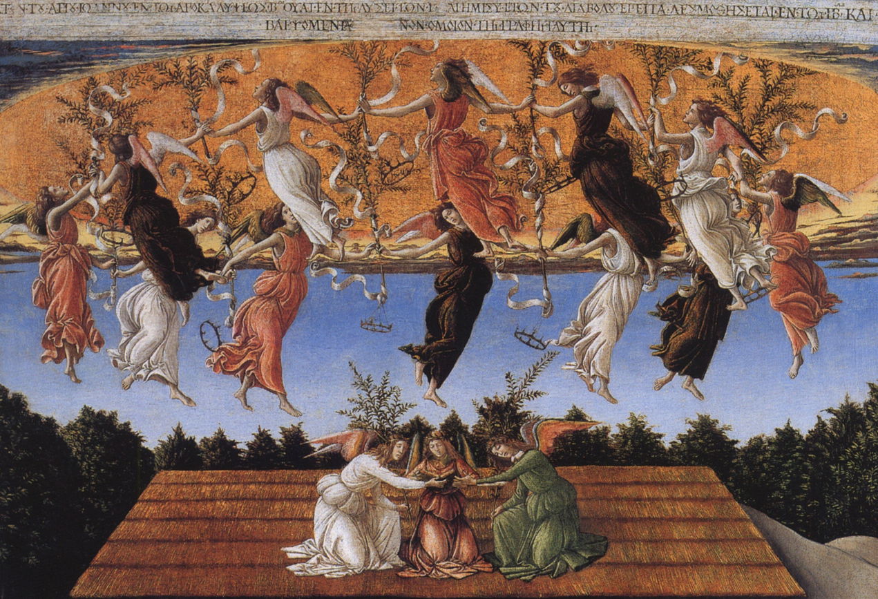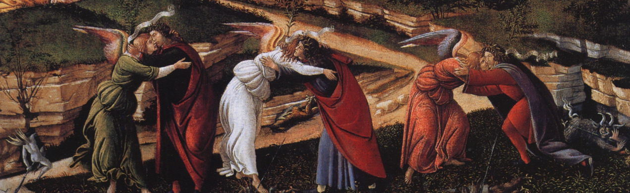 At the foot of the nativity scene is another passage which appears strange. Three angels are seen embracing men, possibly a reference to Savonarola and his accompanying martyrs. Behind them, among the path and rocks, are seven small devils, some of them already impaled on their own weapons, who are fleeing back to the underworld.