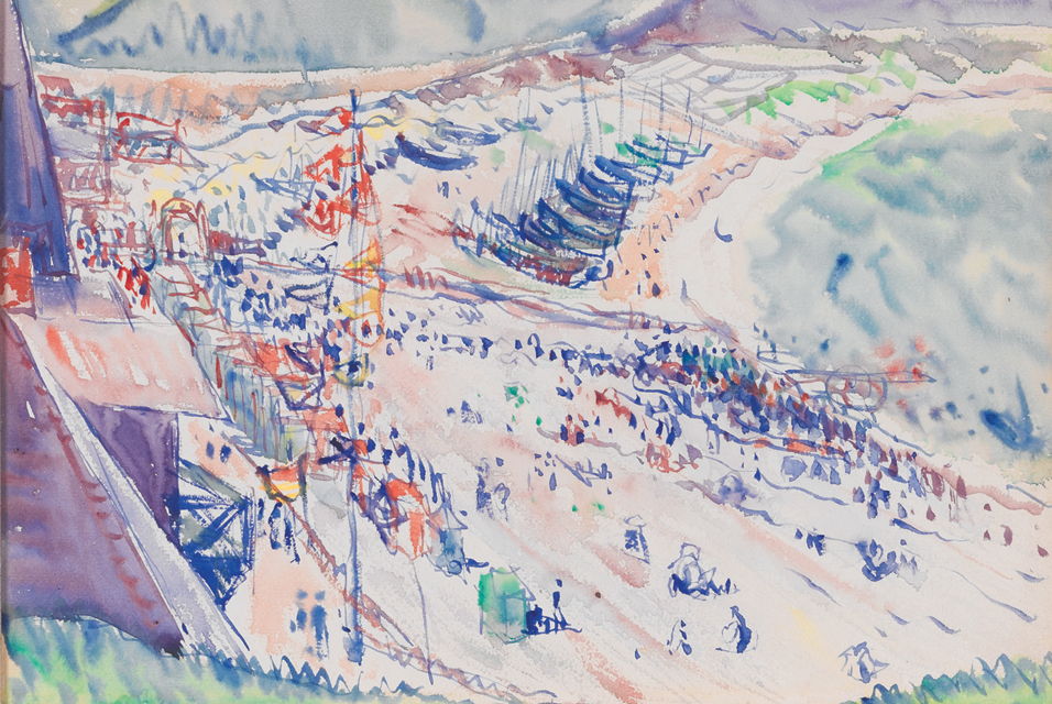 When the American Charles Demuth visited just before the First World War, he took to the top of the cliff and painted his watercolour sketch of the Beach at Étretat (c 1913), one of a couple of works he made of French beaches which are very sketchy in style, with people shown almost as annotations rather than forms.