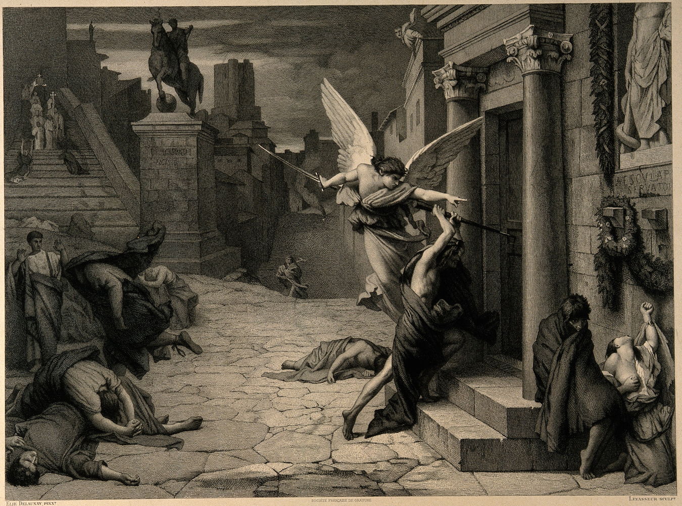 Jules-Élie Delaunay’s The Plague of Rome (1869) is based on the description in The Golden Legend, a mediaeval compilation by Jacques de Voragine, of plague raging in the city. A pair of angels were claimed to have appeared, one good, the other bad. The good angel then gave the commands for people to die of the plague, and the bad angel carried those commands out. At the right edge of the canvas, the white statue appropriately shows Aesculapius.