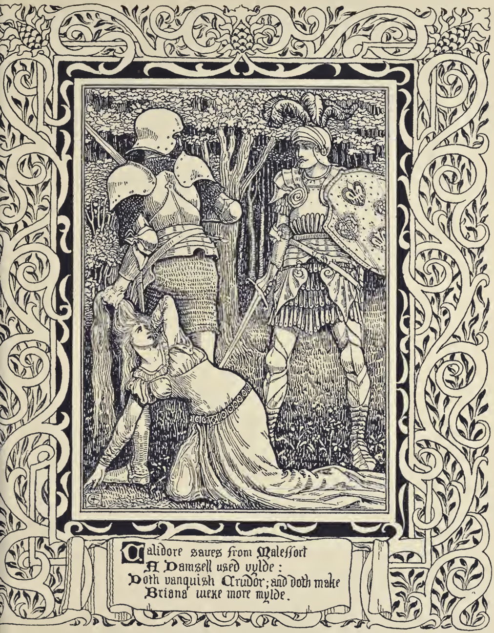 Once Crudor arrives, Calidore rides out to fight him. They knock one another from their mounts with their lances, then battle on foot with swords. Calidore soon strikes Crudor a mighty blow on the head, putting him on the ground. When Calidore removes his opponent’s helmet to administer the fatal stroke, Crudor begs for mercy. The victor grants that on the terms that he learns his lesson and shows due courtesy. They bind this with an oath, and Calidore tells the knight to wed Briana. The couple offer the castle to Sir Calidore, but he hands it over to the young squire and his lady in recompense for their suffering at the hands of Maleffort.