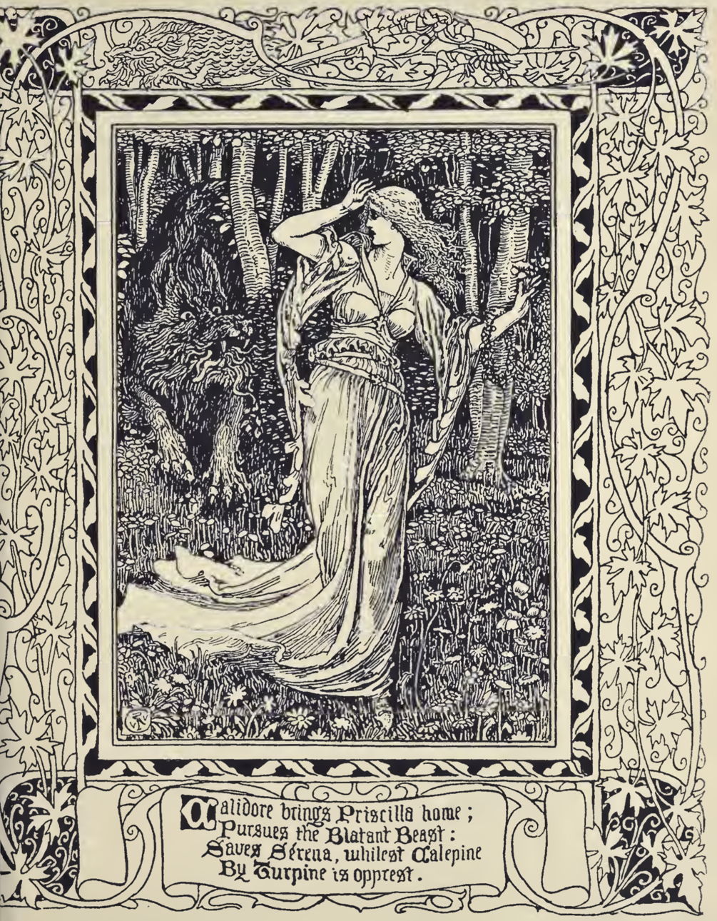 As Calidore is riding past a secluded glade, he sees a knight and his lady resting there, to their embarrassment. He stops to talk with this knight named Calepine and his lady Serena, only to be interrupted by the sudden appearance of a wild beast which snatches her up in its jaws and runs off. Both knights give chase, Calidor overtaking it rapidly. Seeing him, the Blatant Beast drops Serena and flees in fright.