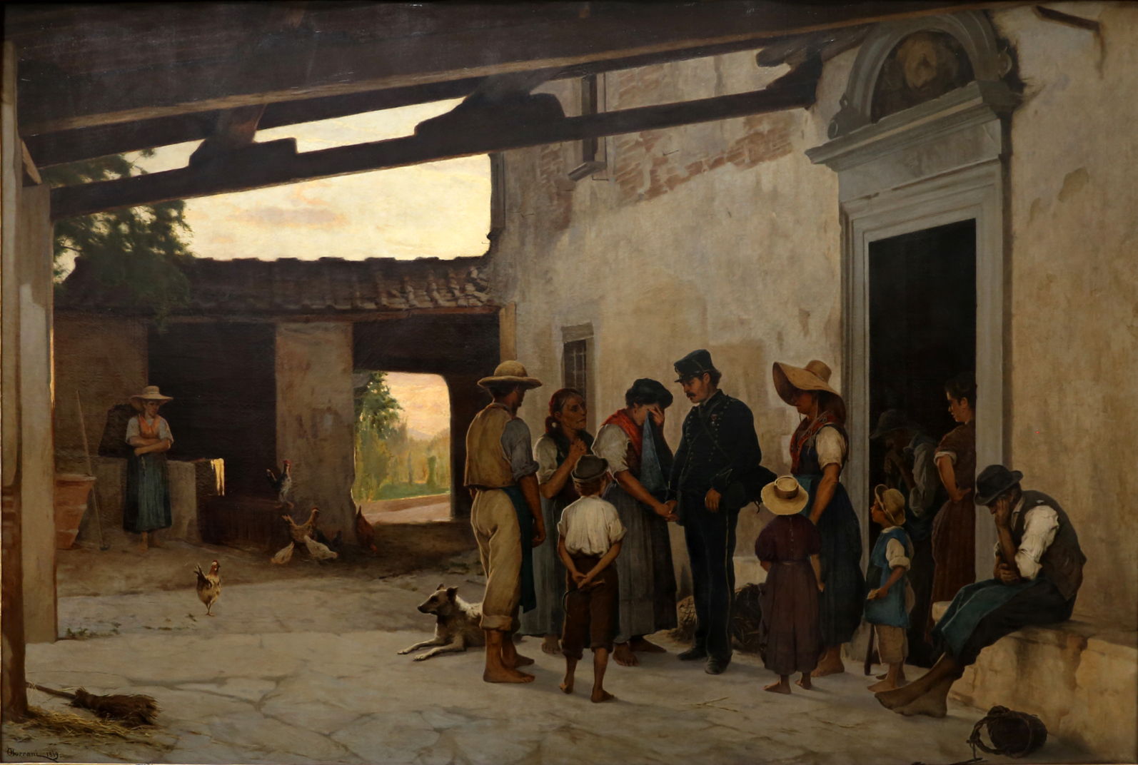 Borrani painted Call-up of the Reserves in 1869, and it may refer to events during the Third War of Independence in 1866 or the difficult years afterwards. A man in military uniform is making his farewells to his family, in the yard of a farmhouse in the country. Athough the family don’t appear particularly poor, the reservist is the only person seen wearing footwear.