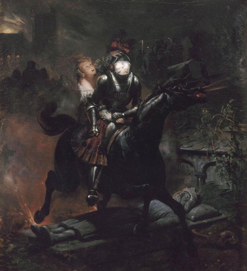 Horace Vernet, in The Ballad of Lenore, or The Dead Travel Fast from 1839, shows Lenore’s dead fiancĂ© William transforming into the figure of Death, as their horse crosses tombs in the graveyard.