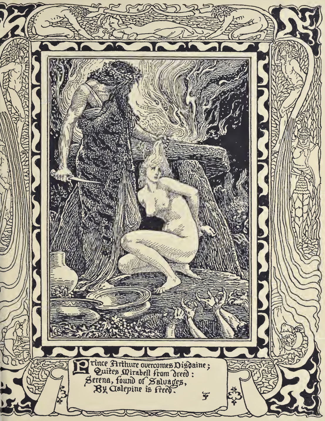 The noise they’re making draws the attention of Calepine, who has been searching for his lover. He rushes over, arriving just as the priest is about to kill Serena. The knight’s sword quickly puts a stop to their murderous plans, and the priest and cannibals are killed instead. When Calepine turns to free Serena, she is silenced by the shame of her nakedness, and in the dark, he doesn’t even recognise her until sunrise, when they’re reunited.