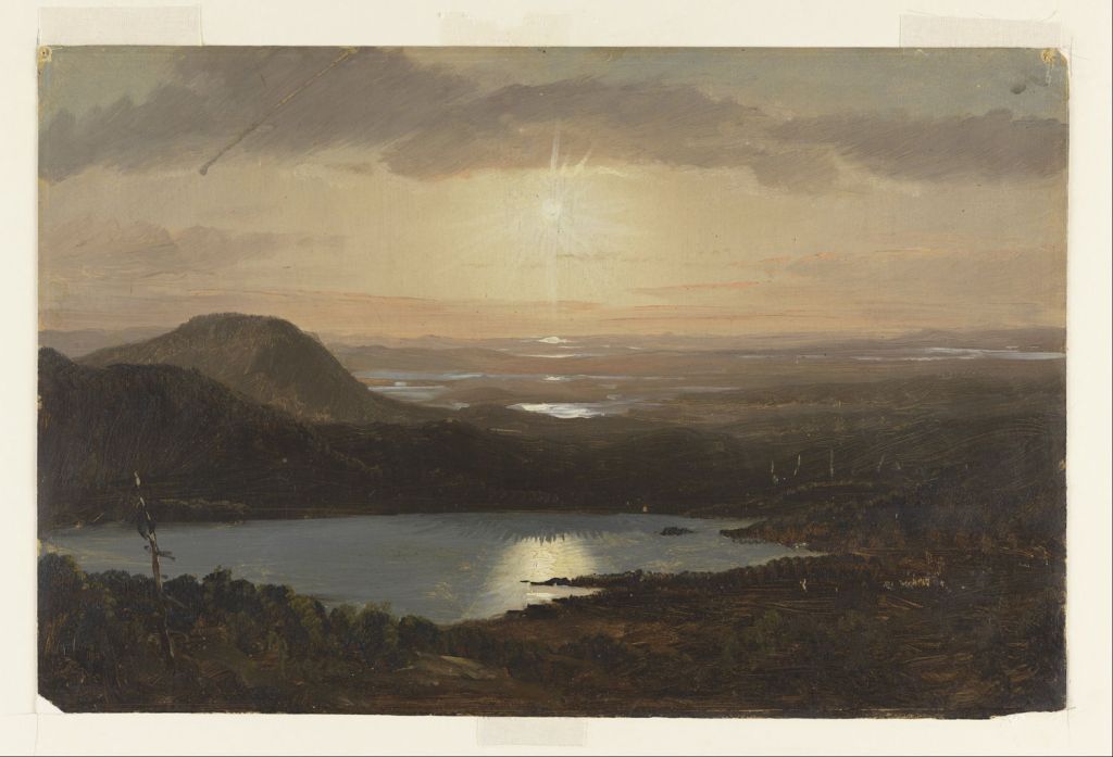 Church’s Eagle Lake Viewed from Cadillac Mountain, Mount Desert Island, Maine from the 1850s is unusual. Painted in oil over a graphite drawing on paperboard, it doesn’t appear to have been completed in front of the motif, but must have started off en plein air. Cadillac Mountain is relatively low, at 466 metres (1530 feet), but the highest point of Mount Desert Island, which affords this spectacular World View.