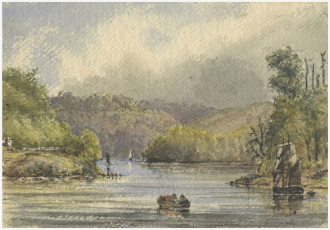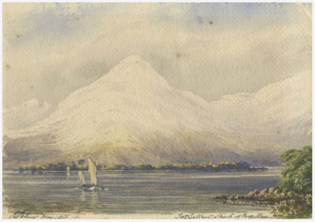 Sailing further south, he reached southern Chile, where he painted A ‘canal’ at Port Mouth, South Chile (1866). These are naturally-occurring waterways which dissect much of the coast in this area.