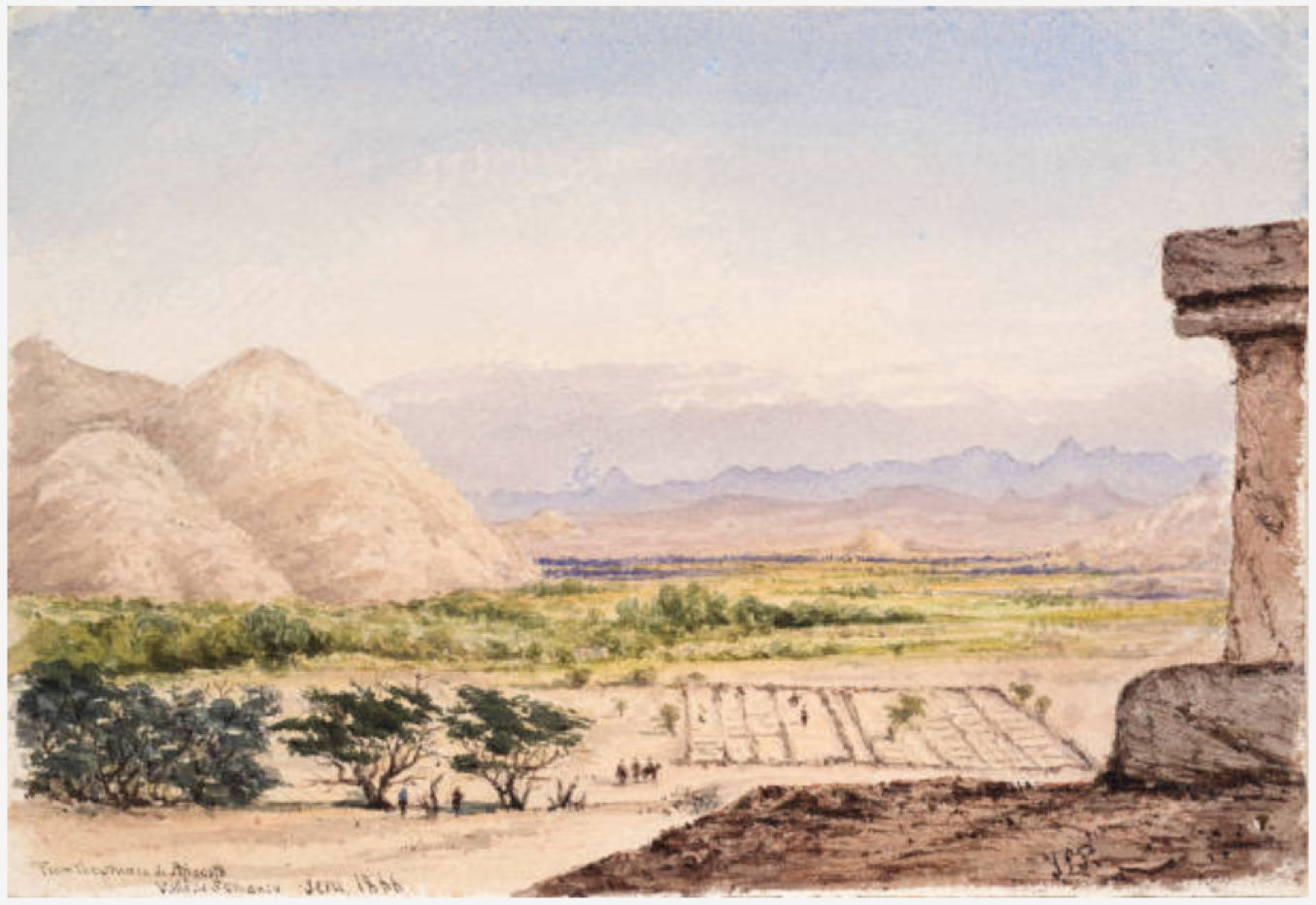 Palmer returned to central America in 1866, when he painted this view From the top of the Huaca de Apacote, and the ruins of an Inca camp and village. Most of his landscapes show marked formal aerial perspective, suggesting that he had undergone instruction at some time during his youth.