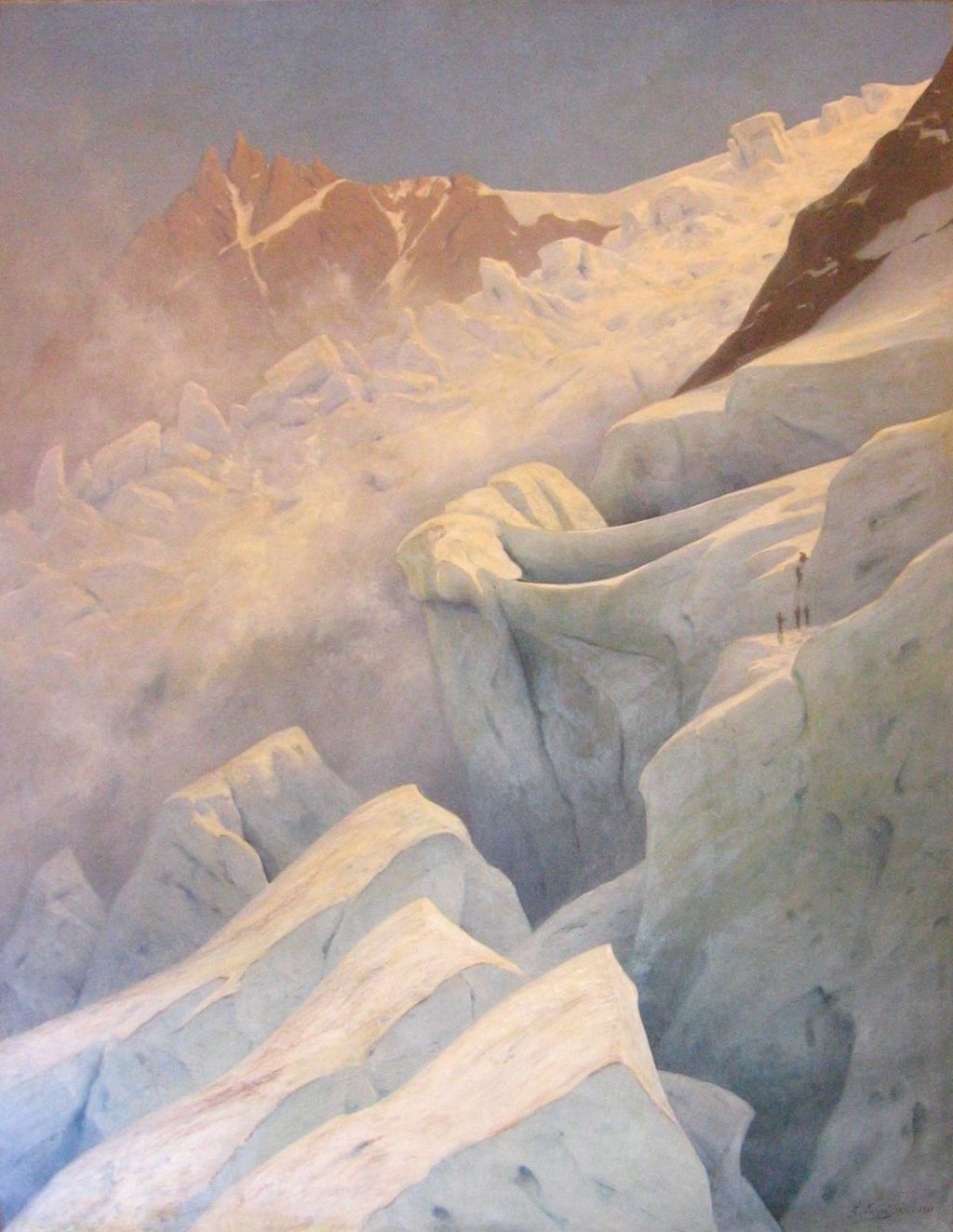 Surviving original paintings are now in the collection of the Alpine Club in London, and formed the basis for this lithograph of Mountaineers Scaling a Wall of Ice above a Precipice (1828).