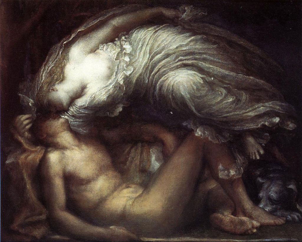 I don’t know whether George Frederic Watts’ painting of Endymion (1872) refers to the original Greek myth or to John Keats’ reinterpretation in his 1818 poem Endymion. It shows Endymion making love with Selene or ‘Cynthia’, as Keats named her. This is one of Watts’ most painterly works, and appears to have come straight from his emotions. This also marks his transition from painting Pre-Raphaelite staples such as mediaeval knights and legends, to his later works which were more allegorical and even frankly symbolist.