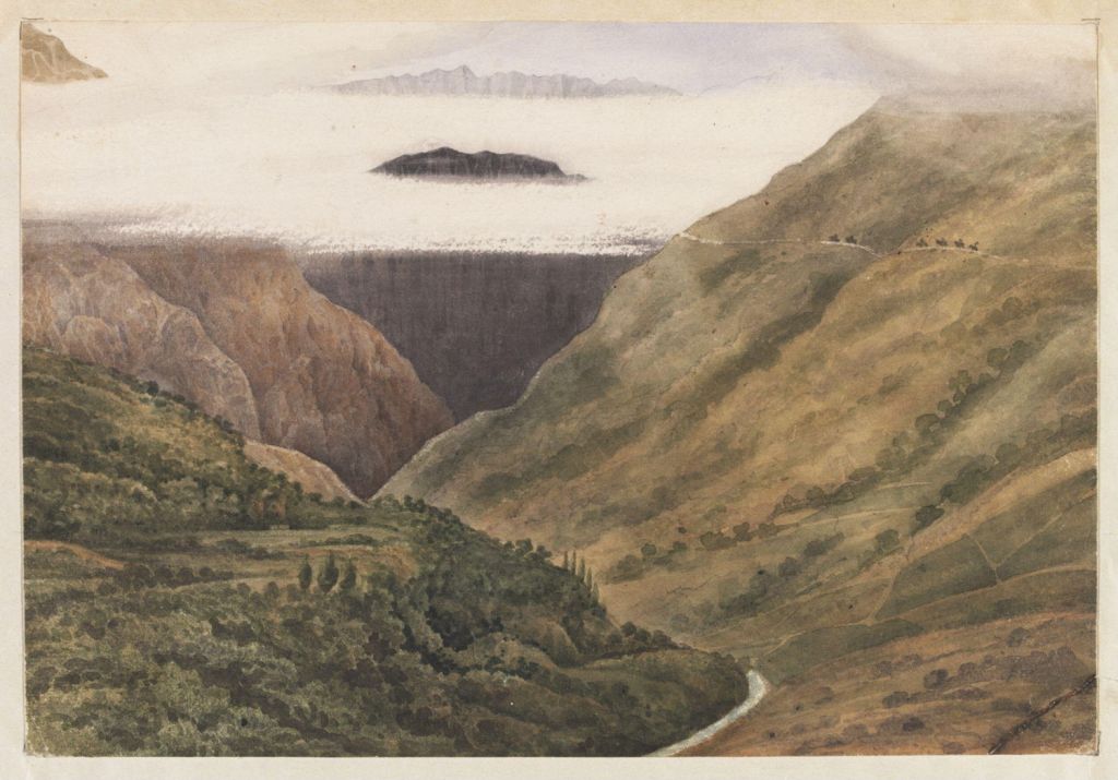 By July of that year, Vigne had reached Hazar Chum Mazenderan – Persia, in mountains midway between the port of Chalus on the Caspian Sea and Tehran in Iran. The layers of low cloud create a spectacular effect as the distant mountain ridges float in the sky high above the gorge cut deep by the River Chalus.