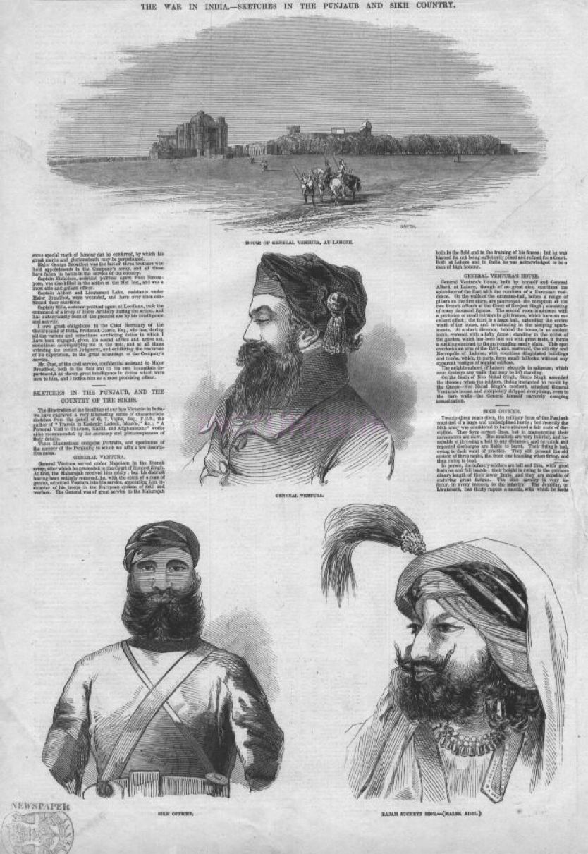 In 1846, as the first battle was fought in the Punjab between the forces of the East India Company and the Sikh Empire, engravings made from Vigne’s sketches and paintings were published in the Illustrated London News. This page shows The War in India: sketches in the Punjaub and Sikh country: house of General Ventula, at Lahore; General Ventula; Sikh officer; Rajah Suchett Sing (Malek Adel).