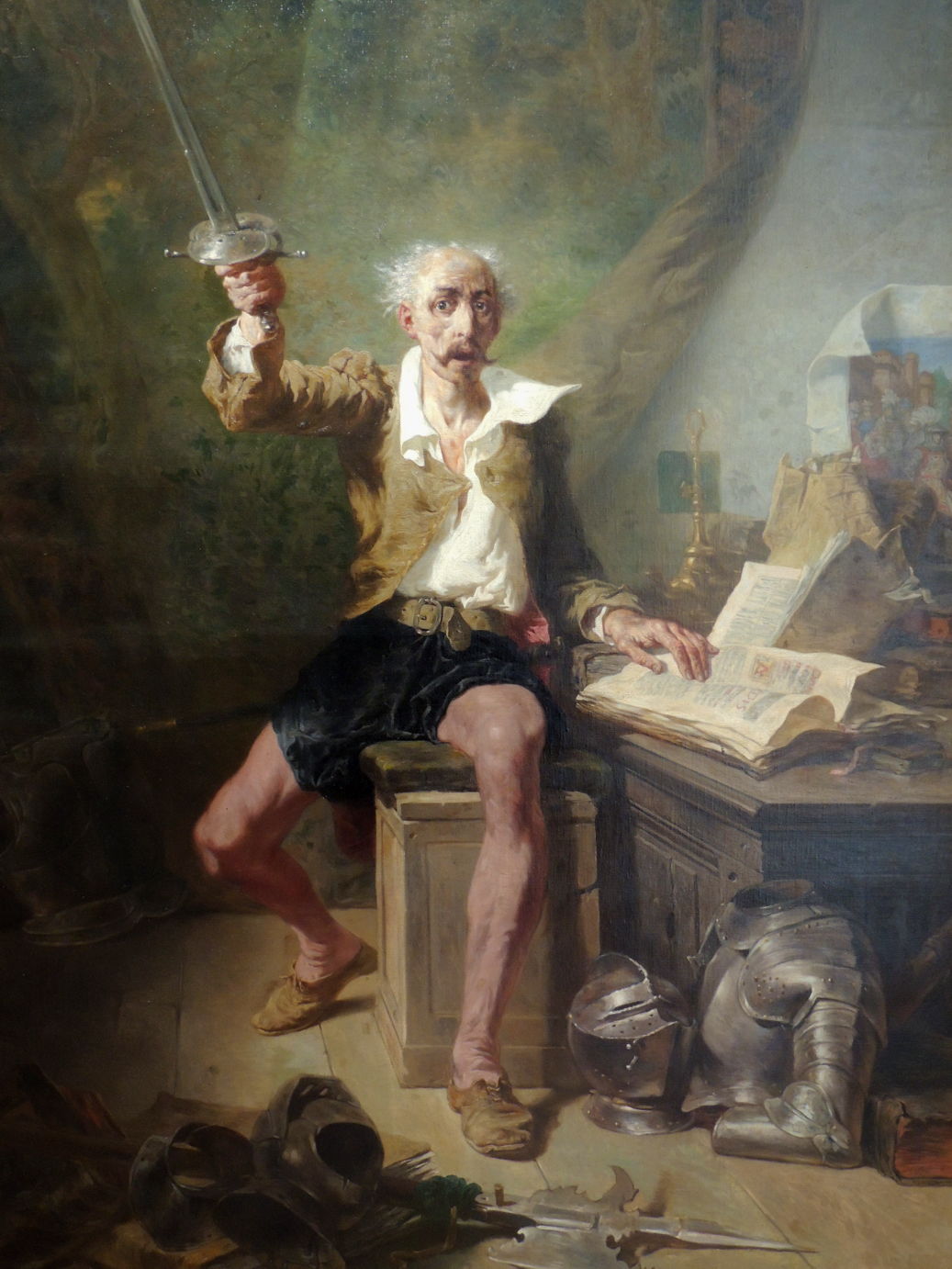 Mariano de la Roca y Delgado’s Miguel de Cervantes imagining El Quixote from 1858 expresses that visually.