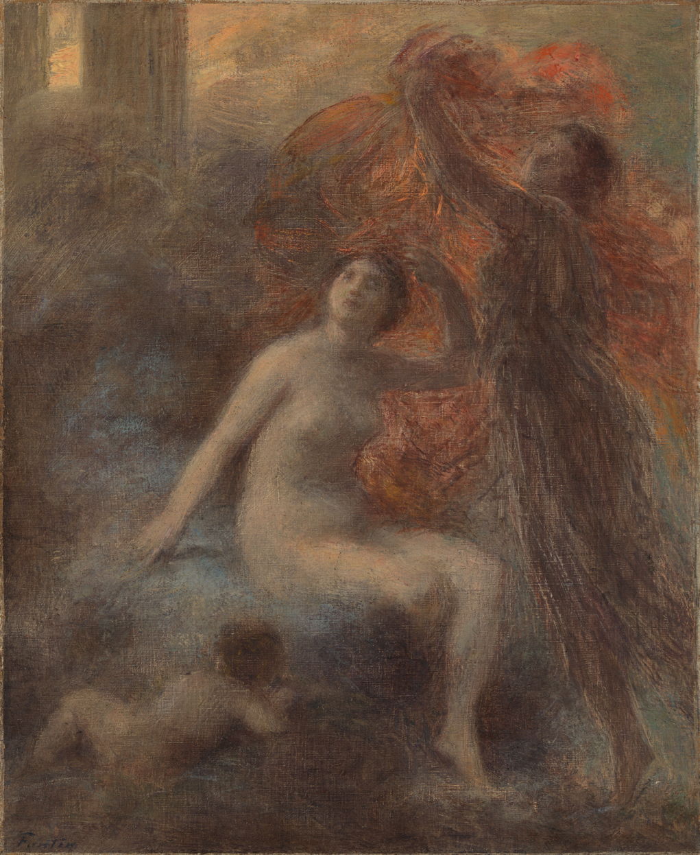 She also features in one of Henri Fantin-Latour’s unusual fantasies from late in his life. The Palace of Aurora from 1902 is an ethereal painting of a motif which might have come from the older artists of the Royal Academy in London. Aurora is here being disrobed by the personification of night, those diaphanous robes being lit by the red of the sunrise.