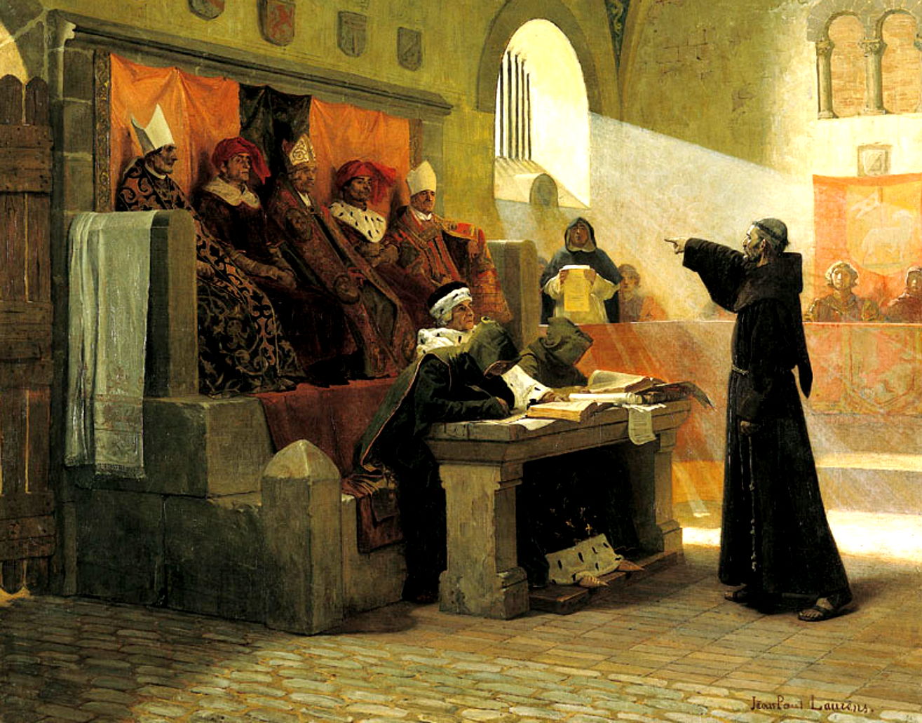 In 1887, Laurens returned to the theme of Bernard DĂ©licieux and the history of Carcassone. Eventually DĂ©licieux’s campaign against the Inquisition caught up with him. In 1317 he was summoned to Avignon, where he was arrested, interrogated, and tortured for a year. He was taken back to Carcassone for trial in 1319, found guilty of some of the charges, and sentenced to life in solitary confinement. He died in prison the following year.