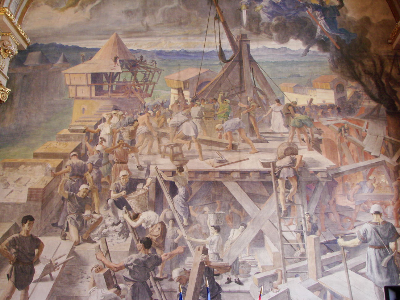 Laurens’s Toulouse Fortifies its Defences to Resist Simon de Montfort 1218 (1899) shows this frantic work being carried out by men and women alike, to strengthen the walls of the city, including the erection of a shelter on the top of a tower, weapons for hurling rocks at the enemy, and more.