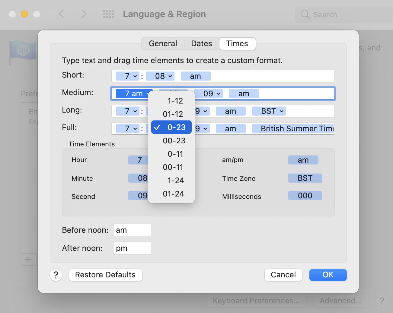 Those aren’t at all helpful: as you can see, if the hour is set to the range 0-23, in a 12-hour clock that shows up as “7 am” not “7”. This pane also allows individual apps to use custom date and time settings, which appeared promising.