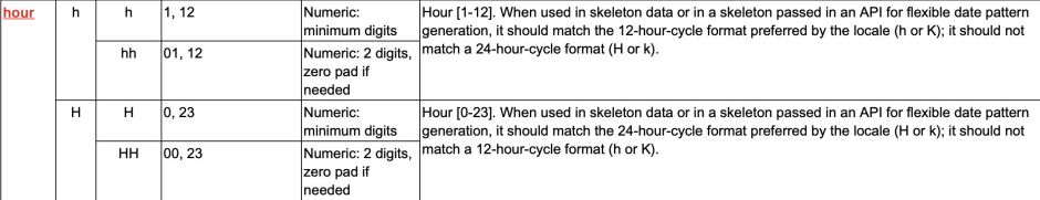 Apple doesn’t define the formatting strings used internally, but relies instead on a series of reports provided by the Unicode Consortium referred to as Report TR35. These are minutely detailed specifications, and for my purposes here I’ll look at just one element, the formatting of numbers representing hours. Here are two main options: HH sets the hour to digits ranging from 00 to 23 to represent the 24-hour clock padded with a leading zero when necessary, and a single h sets them as unpadded digits ranging from 0 to 11, or perhaps even 1 and 12. Thus, when software wants to format a Date for use with the log show command, the formatting string should be