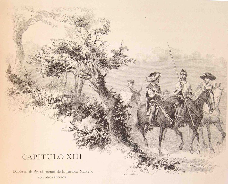 That prompted Don Quixote to defend her reasons and honour. The shepherds completed the burial, burning the dead man’s papers, and covered the grave with a rock slab until its tombstone could be installed there. The ceremony completed, they all dispersed, Don Quixote going in pursuit of the shepherdess, to offer her his services – something which didn’t work out as he had intended.
