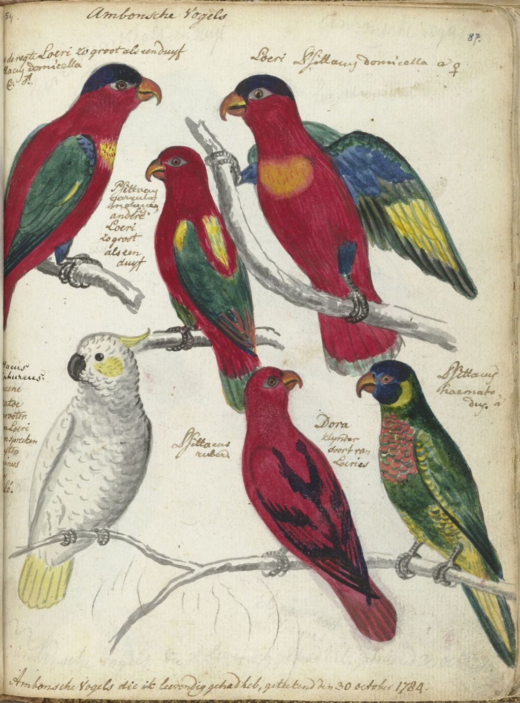 These Ambon Birds from 1784 were found on Ambon Island in Indonesia, and include species of parrot.