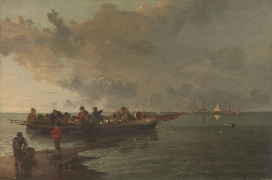 Yarmouth Beach shows the working beach to the north of the breakwater which Crome had painted earlier. Local fishermen are busy, and the background is industrial. Over the following century, Yarmouth slowly changed into the beach resort of Great Yarmouth, which became popular with those living in the industrial cities of the Midlands.