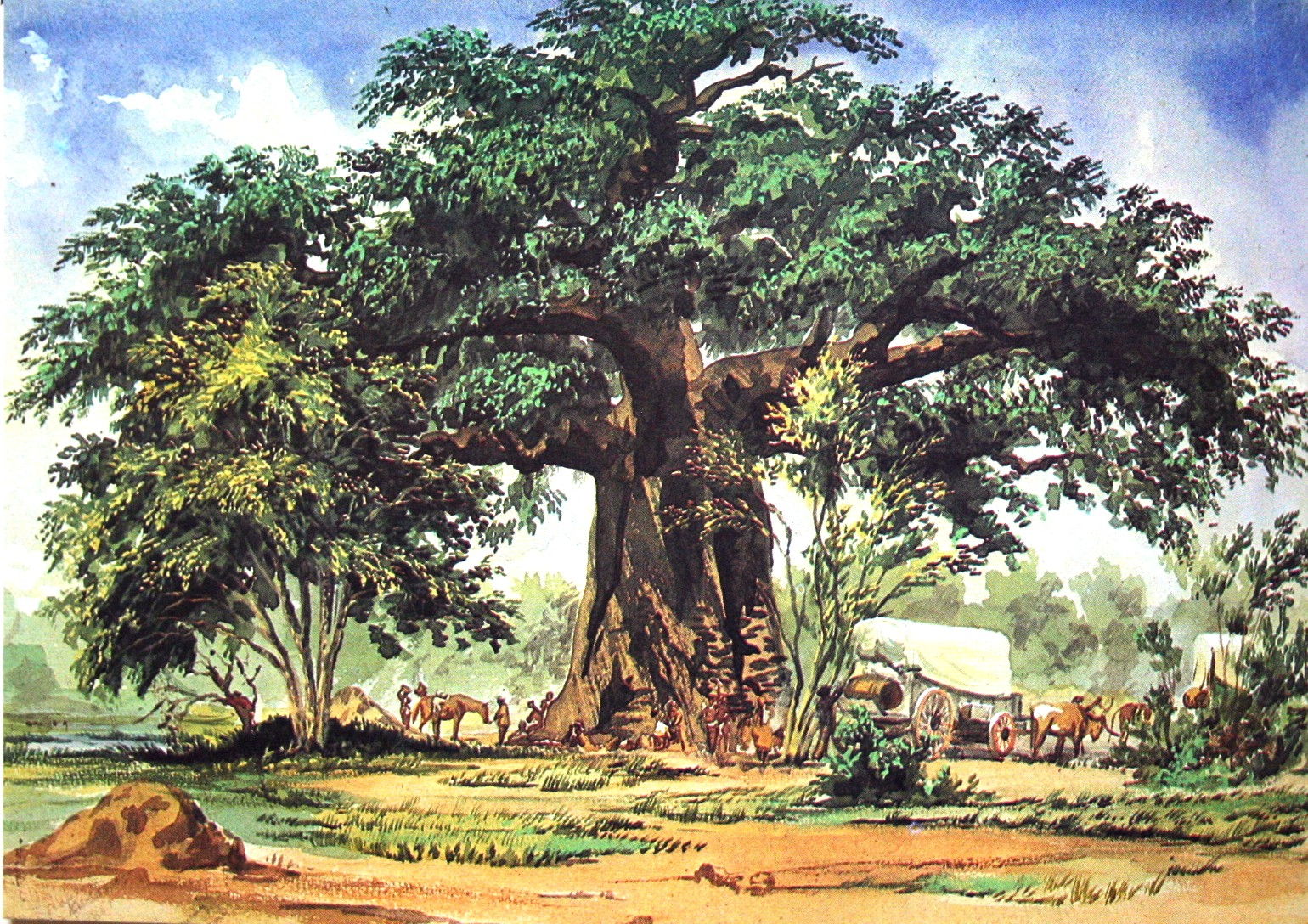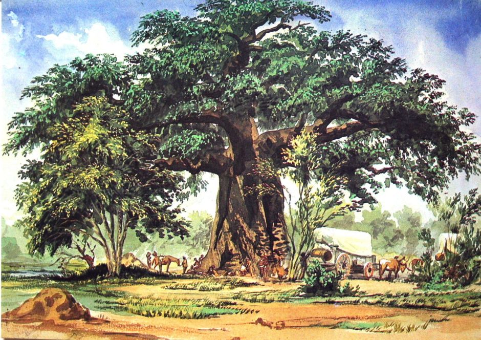 He painted this watercolour of a Baobab Tree, South Africa in 1861, before he left on his next expedition with James Chapman to Namibia in 1861-62. That is thought to have been the first expedition which made extensive use of both photography and painting. By the end of that, Baines was exhausted and his health was deteriorating, so he spent some time back in Cape Town preparing his paintings for exhibition, and writing an illustrated account of his travels with Chapman.