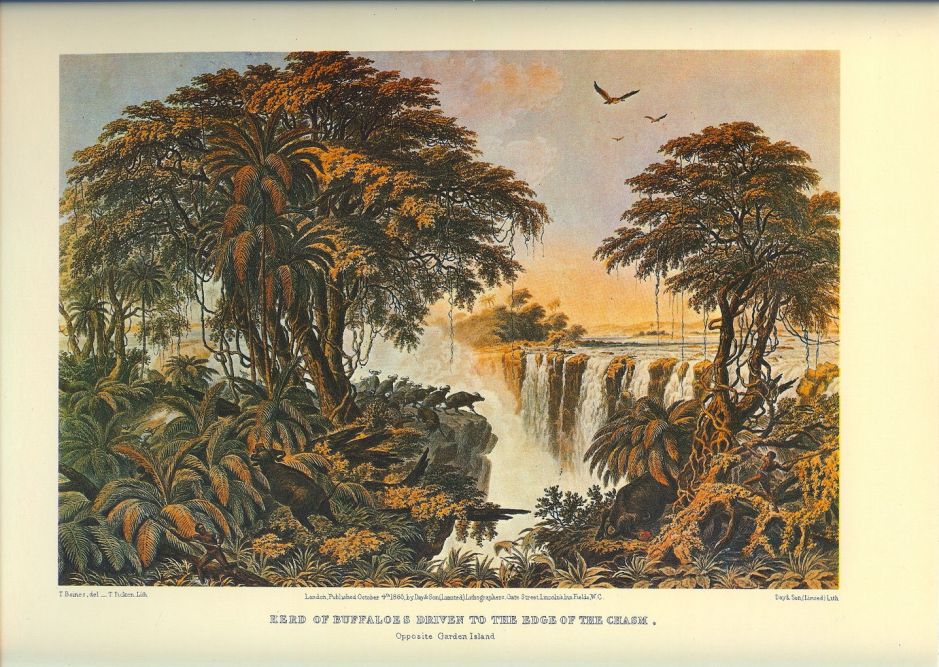 Herd of Buffaloes Driven to the Edge of the Chasm, Opposite Garden Island (1865) shows a buffalo hunt in progress at Victoria Falls, with men attacking the animals with a mixture of spears and rifles.
