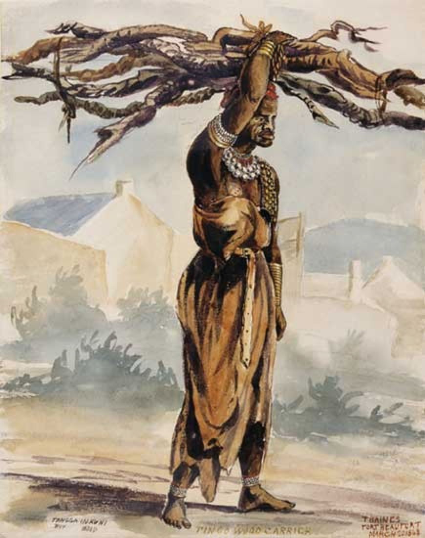 He sketched this Fingo Wood Carrier (1848) using pencil, pen, India ink and watercolour. The Fengu people come from a variety of ethnic groups and have now been assimilated by the Xhosa, in Cape Province.