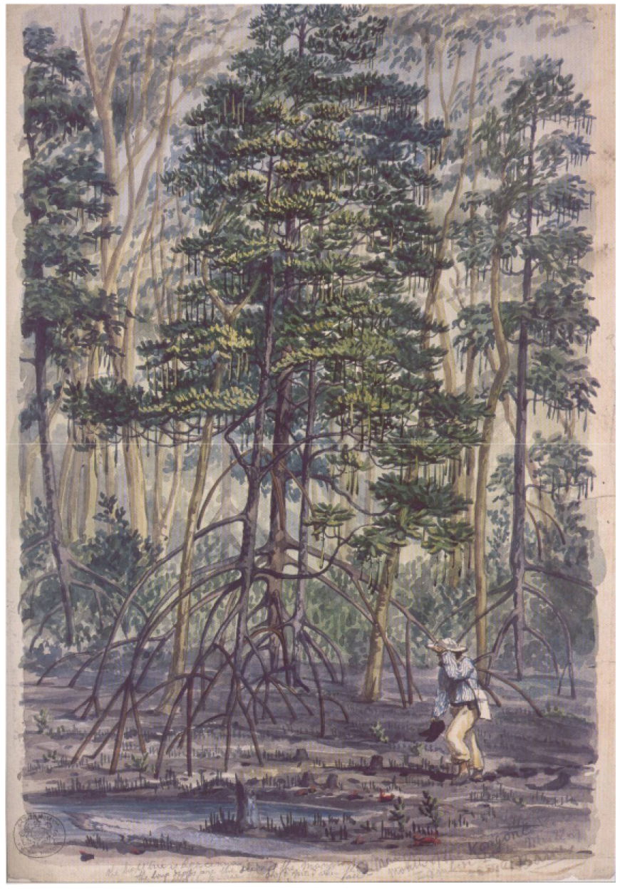Baines painted this Mangrove Swamp at Low Water near the mouth of the Kongone River, Zambezi, in November 1859.