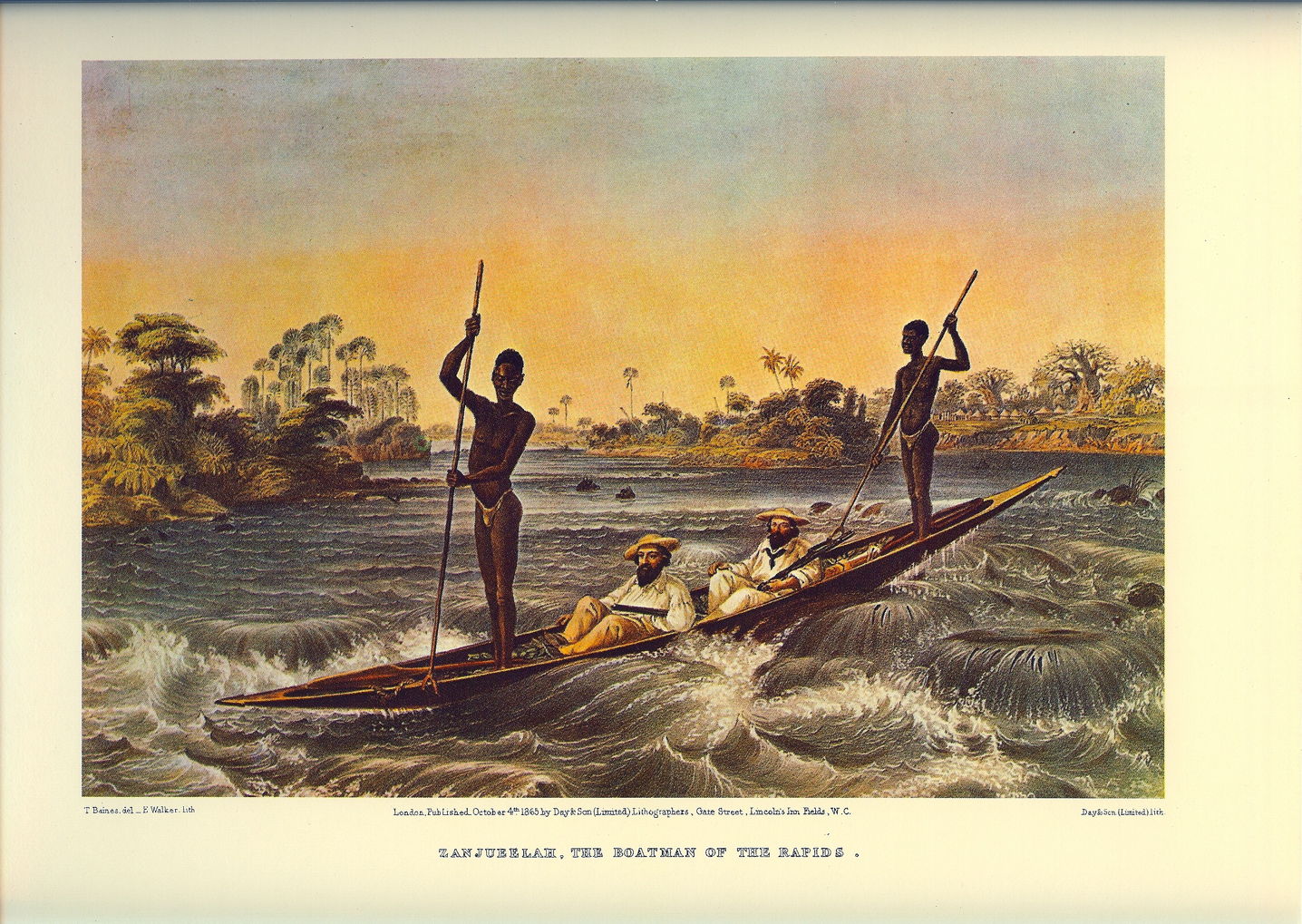 Zanjueelah, the Boatman of the Rapids (1865) may show Baines’ party on the Zambezi River near Victoria Falls.
