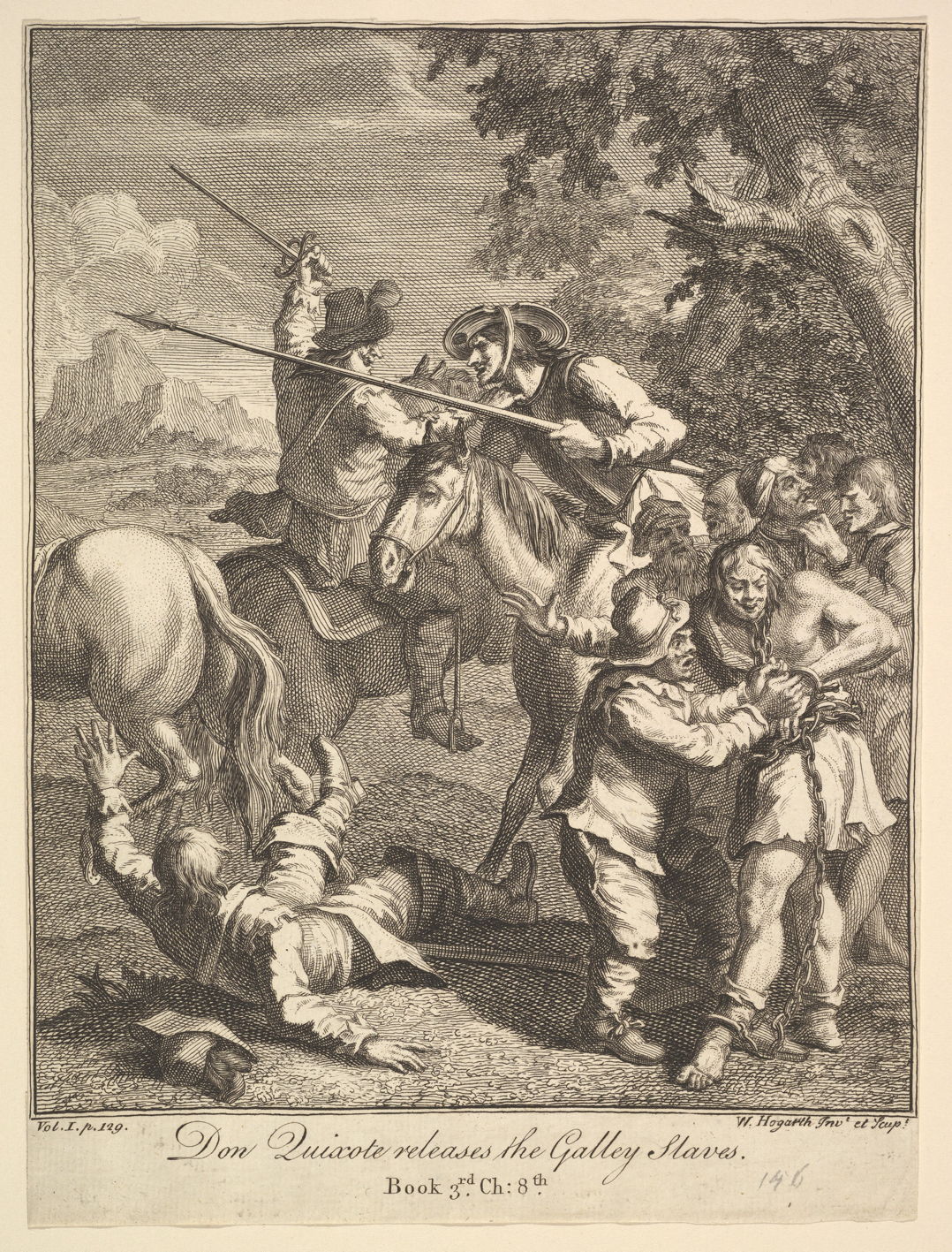 The next convict had been a pimp, which Don Quixote said didn’t justify his punishment. Eventually, the knight concluded that it was his duty to set them free, and for their guards to release them. Their sergeant said this was a joke, and told Don Quixote to clear off. The knight suddenly knocked the sergeant to the ground with his pike. The other escorts attacked Don Quixote, but the convicts had broken their chain and were already busy removing their shackles, with Sancho’s assistance. The squire seized the sword and musket from the fallen sergeant. As he waved the firearm at the escorts they turned and ran, pursued by rocks hurled by the convicts.