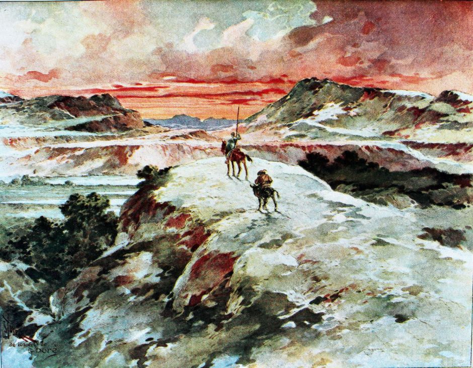 Don Quixote and his horse Rocinante, who had also fallen under the bombardment, lay next to one another. The knight expressed his regret at having done good to unappreciative rabble, but Sancho was sure that he still hadn’t learned his lesson. The squire warned his master of the imminent danger of the Holy Brotherhood of Toledo. After a little argument, they mounted and rode away towards the mountains to find some rough country to hide in.
