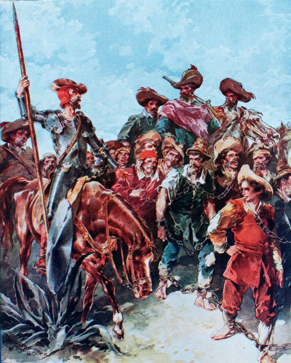 When Don Quixote looked up he saw to his surprise twelve men wearing shackles and chained in a long line. They were plodding along the road with four men escorting them: two mounted and bearing muskets, and two on foot. Sancho recognised them as convicts on their way to crew the King’s galleys, but when he mentioned this was a forced march, Don Quixote decided that no one should be forced, and that he had a duty to liberate them.