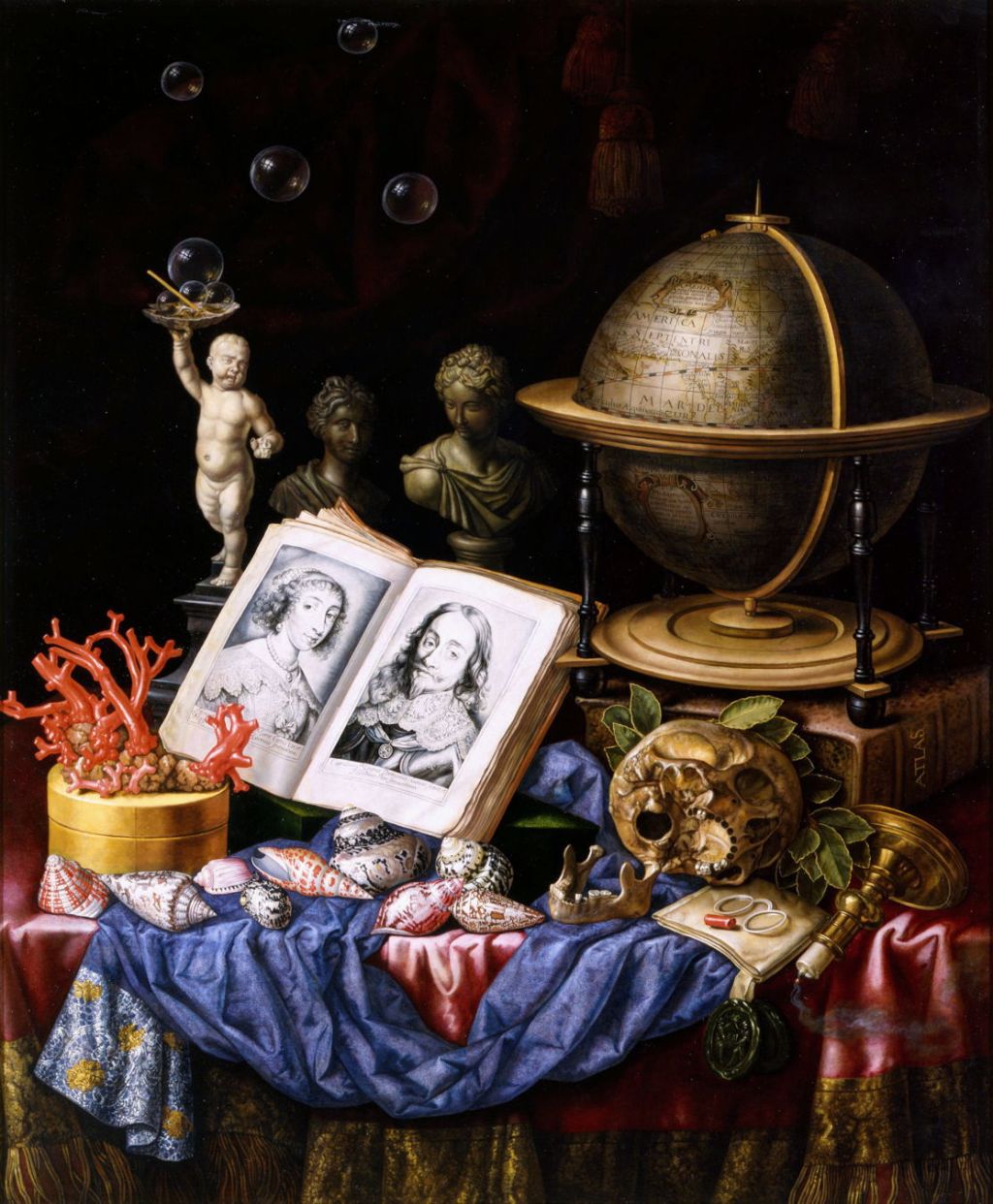 Seashells are commonly included in the eclectic combination of symbolic objects in vanitas paintings, such as Carstian Luyckx’s undated Allegory of Charles I of England and Henrietta of France in a Vanitas Still Life. Included here are a globe, the physical world itself, the gall from a tree, a snuffed-out candle, seashells, and coral. He uses another common device found in vanitas painting: an open book, here showing King Charles I, who was executed in 1649, and his wife Henrietta Maria of France, who was deposed as queen of England by the civil wars, which forced her to flee to France in 1644.