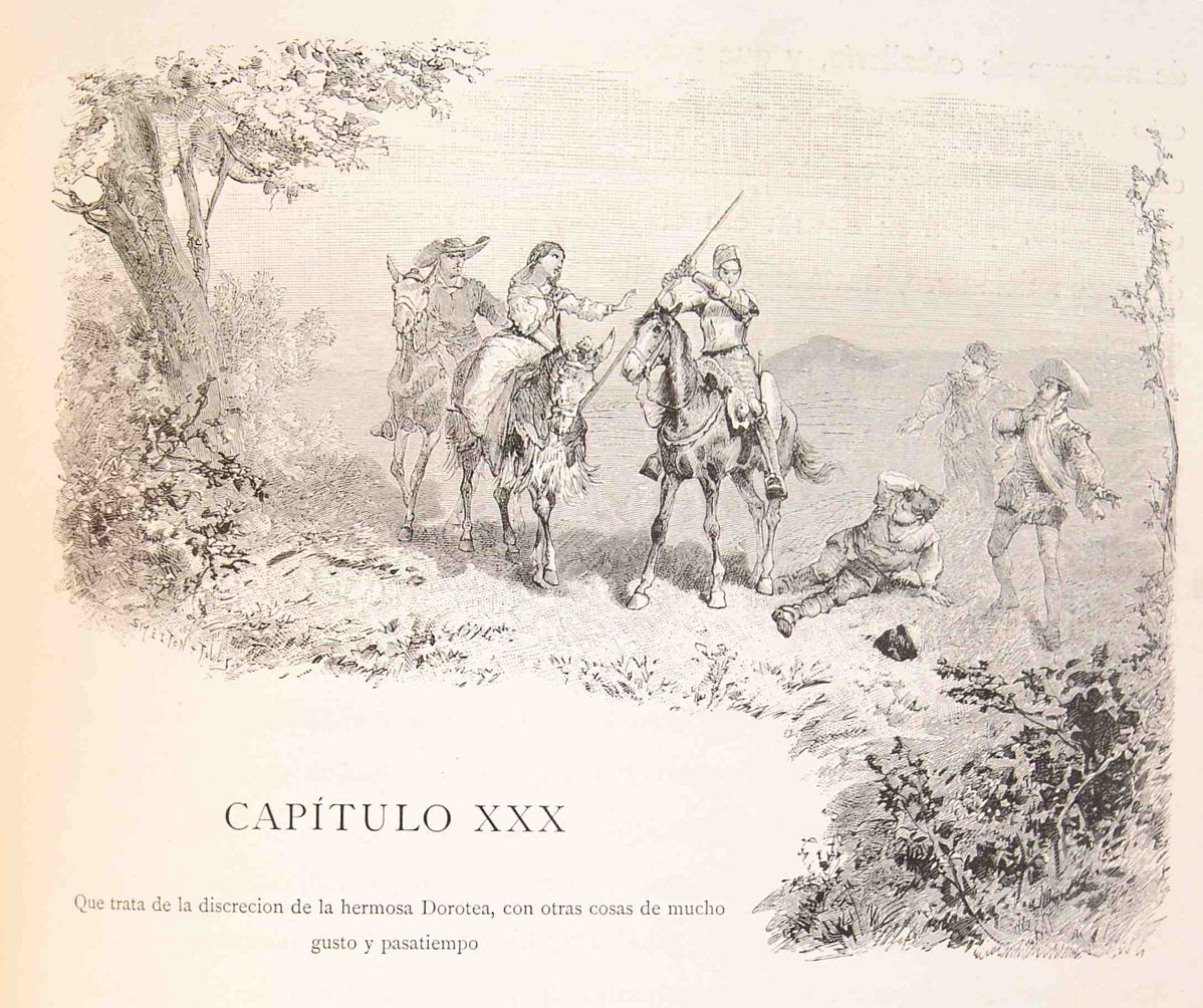 Sancho Panza broke the silence by revealing that it had been his master who had freed those convicts, causing Don Quixote to explode with anger. Dorotea defused the situation by giving an imaginary account of her life as a princess. She unfortunately mentioned that the knight who would rescue her had a mole on his back, which prompted Don Quixote to want to undress to confirm it. His squire confirmed the presence of the mole, though, sparing the party of the sight.