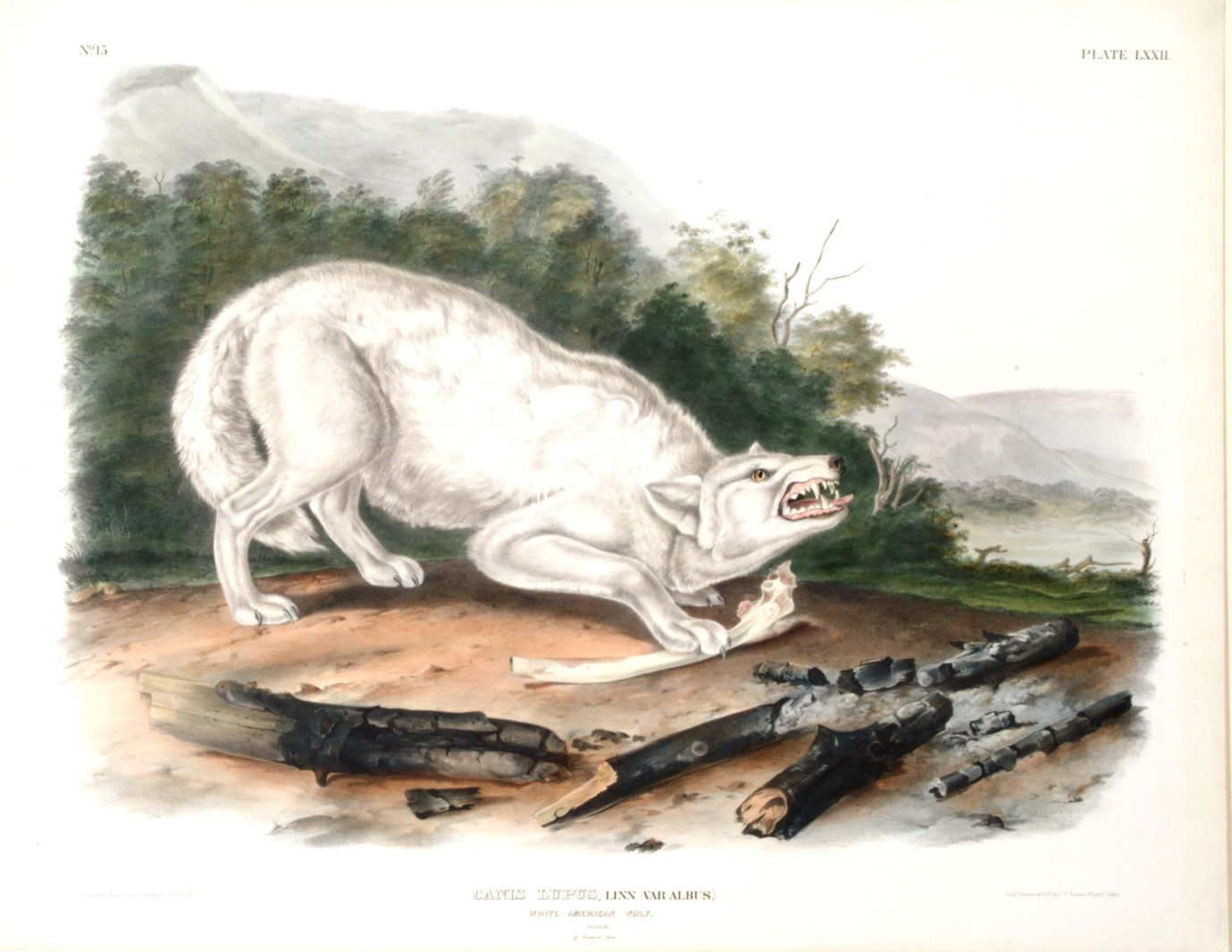 This colour lithograph of a White American Wolf from 1845 is also controversial. Currently, the white-coated Arctic wolf (Canis lupus arctos) is known as a subspecies of grey wolf found in the Queen Elizabeth Islands, in the far north of Canada, not far from Greenland. Historically, other subspecies of wolves which have white coats have occurred further south. It’s not clear which subspecies this painting is based on, nor where Audubon may have encountered it in nature.
