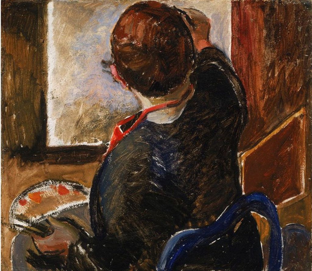 Her Self-portrait from 1924-25 shows her still suffering from her rejection. Most unusually for a self-portrait, she faces away from the viewer, and is working on a painting which is unrecognisably vague and formless.