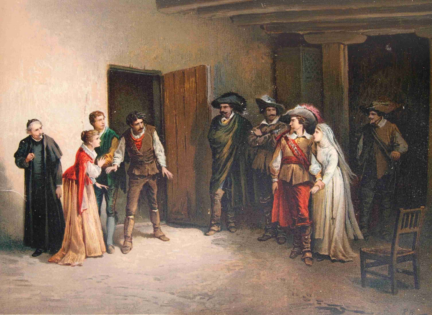 When Fernando had discovered the paper hidden in his new bride’s clothing, declaring that she was already married to Cardenio, he’d intended to kill her. But her parents put a stop to that, allowing her to escape. He later discovered that she’d entered a convent, and took the three horsemen now accompanying him to abduct her, and that was how his group had come to the inn.