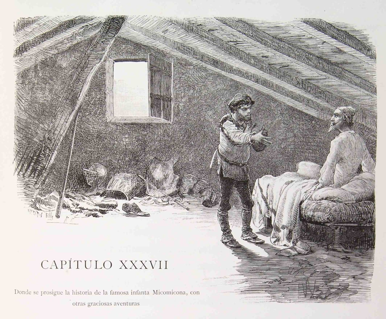 Sancho Panza’s aspirations of nobility were shattered by this, when he learned that Princess Micomicona didn’t exist, and he became concerned for his master who was still asleep and ignorant of the collapse of his chivalric quest. The innkeeper’s wife was delighted, though, as Cardenio and the priest had promised to cover all the costs of their stay at the inn. Sancho went up to Don Quixote, who had only just woken, and broke the news to him. The knight, though, seemed unsurprised at the turn of events, insisting still that this castle was enchanted.