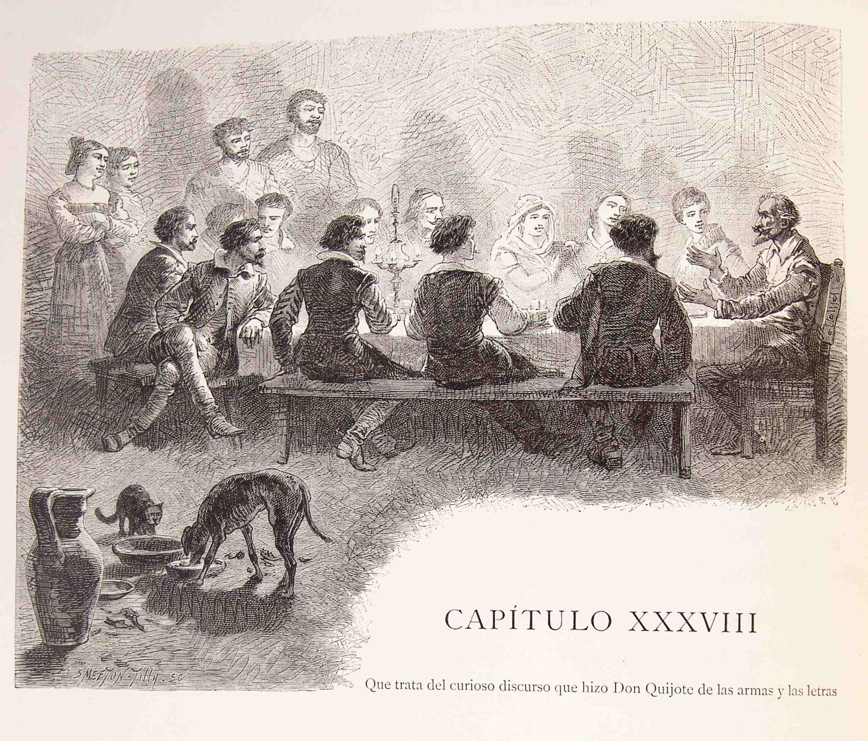 Night was falling, and the innkeeper hastened to put together a meal fit for his noble guests. As they were reaching the end of their supper together, Don Quixote spoke to them in an unusually rational way. When he had described the hardship of being a student, he told them that was nothing compared to those of a warrior, who receives far smaller rewards from his endeavours in battle. He argued in favour of the pre-eminence of arms over letters and learning, giving vivid descriptions of combat on land and at sea, and of the destruction wrought by artillery.