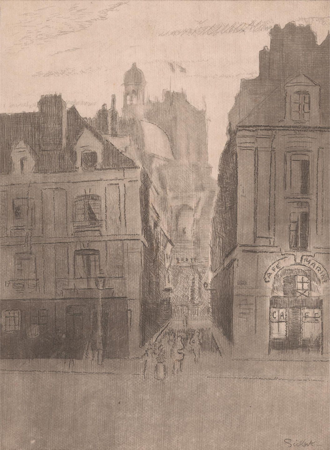Sickert remained an occasional visitor to France, and in 1909 made this fine etching and aquatint of Dieppe, La Rue Notre Dame. In 1920, after the death of his second wife, he moved there for two years, then returned to London.
