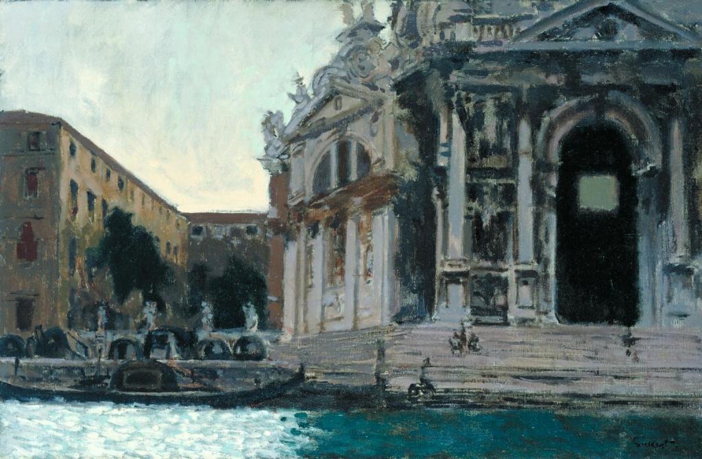 Some views that Sickert painted during his visits to Venice make interesting comparison with those of John Singer Sargent, who was painting the city mostly in watercolour at the time. Sickert’s Venice, la Salute, which he is thought to have completed in about 1901, still uses muted colours, and was clearly painted as an oil sketch. Like other Impressionists, he crops this unusually, showing only a portion of the famous domed church of Santa Maria della Salute. The artist also stressed how he had painted this in “full colour”.