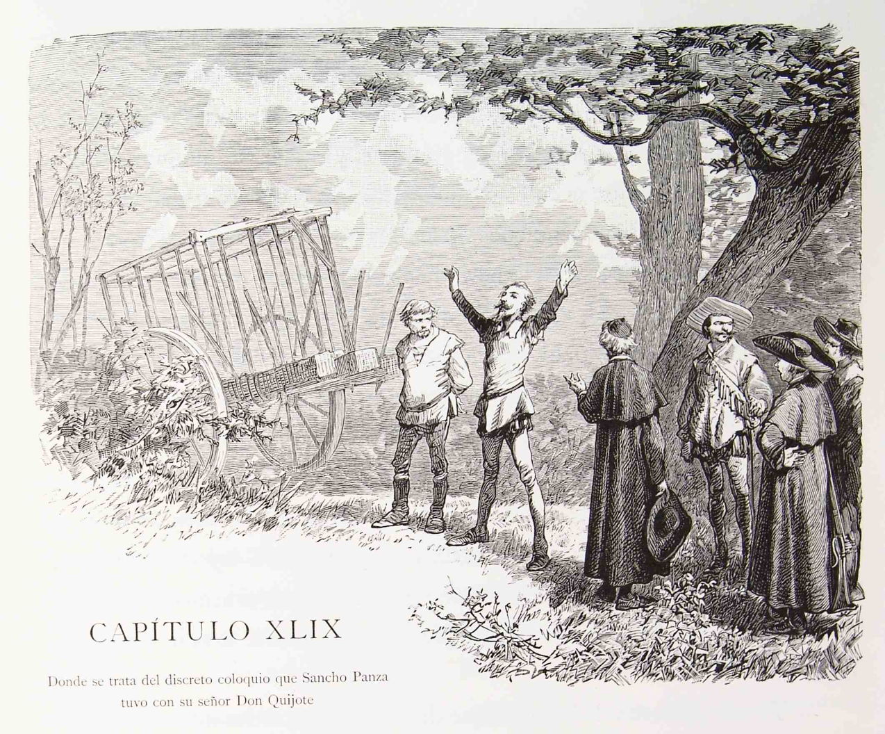 In the previous episode, Don Quixote had been carried away from the inn, in a cage on the back of an ox cart. To maintain the deception of enchantment by which that had been accomplished, the priest and his friend the barber wore masks. They met the canon of Toledo on the road, who turned out to be a fan of tales of chivalry. The priest explained the knight’s situation to the canon, and they discussed the vices and virtues of popular fiction. The group reached a beautiful valley where they stopped to rest and feed. This gave Sancho Panza the chance to speak to his master alone, and to try to explain the deception under which the knight had been carried away. At the end of this, Don Quixote admitted that he needed to be relieved in a hurry.