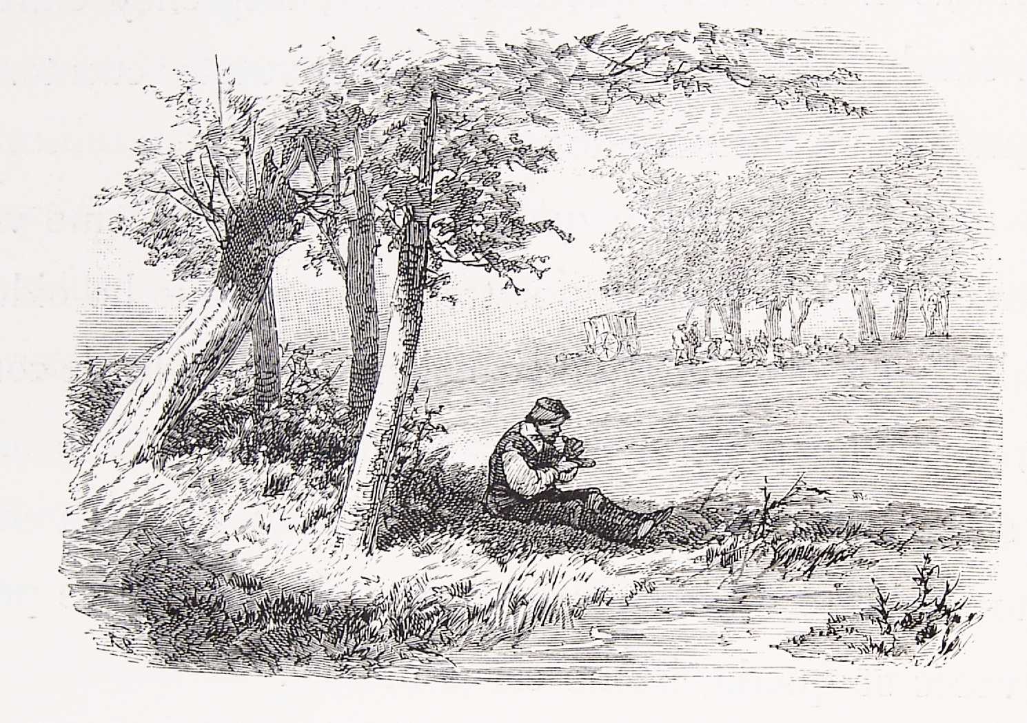 The canon’s servants reached the group with the supply-mule they had brought from the inn, and they soon sat down on the grass to eat. As they were enjoying their meal, a goat broke out of the nearby thicket, followed by a goatherd calling after her. Ignoring her pursuer, the goat ran over to the picnic party and stopped, as if pleading for their protection. The canon invited the goatherd to join them, and he sat down to eat cold rabbit and to tell the group a story. While Sancho Panza went to make a pig of himself down by the stream, the goat lay down beside the goatherd, and he started his tale.