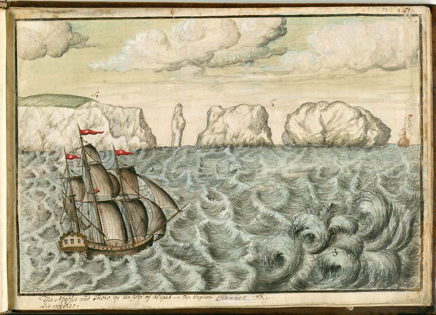 This chalk coastline becomes steadily more spectacular as it reaches the Isle of Wight. The most famous landmark there is the Needles, chalk sea stacks which have been both a welcome and a hazard to mariners over the centuries. These were presumably one of the first sights of Europe when Philipp Georg Friedrich von Reck returned from his pioneering stay in North America. The sea in this page from his sketchbook may appear a little overwrought, but it’s faithful: this channel in the Western Solent is home to one of the more spectacular tidal races of the Channel coasts, and often generates short, steep waves of more than a metre in height.