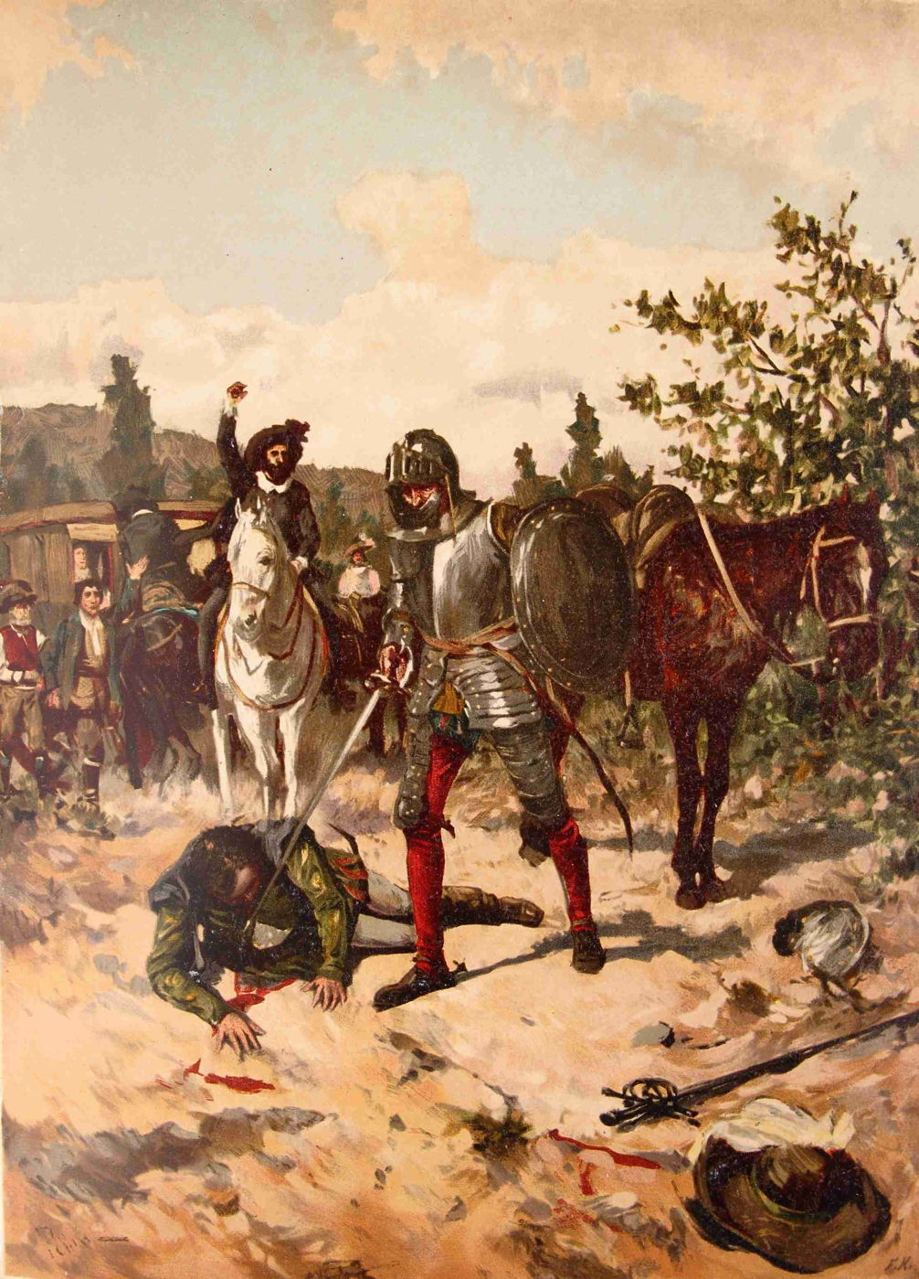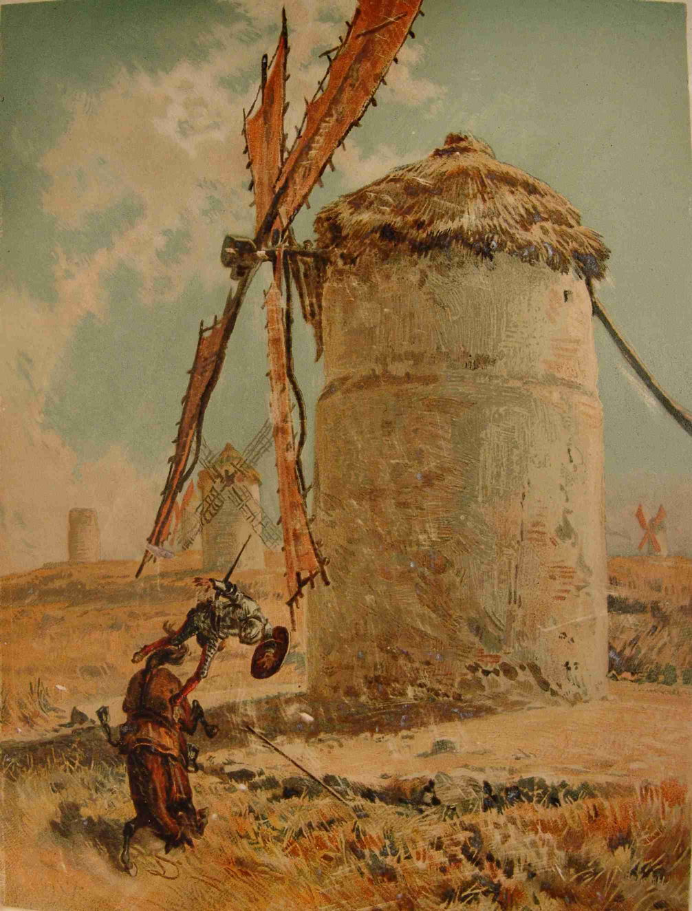 Don Quixote stayed at home for a fortnight, during which he recruited his squire Sancho Panza. They rode off and the knight attacked windmills, believing them to be giants. After a night sleeping under some trees, they next attacked a couple of friars on mules, and a party escorting a Basque lady in a coach. She was travelling to rejoin her husband, but Don Quixote believed she was being abducted. Sancho Panza was given a good kicking by one of the friar’s servants before his knight was confronted by one of the lady’s Basque escorts. His battle with that escort intensified to the point where they both charged at one another with their swords raised, ready to kill.