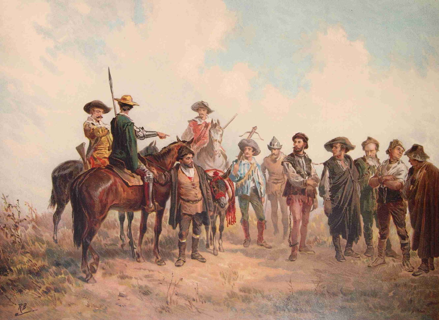 Next Don Quixote and Sancho Panza freed a dozen convicts who were being marched to crew the King’s galleys, but the convicts turned on the pair and bombarded them with rocks before running away. Fearing that they’d soon be visited by officers from the Holy Brotherhood of Toledo, they rode off to hide in the mountains. There they found gold coins abandoned in a travel bag, and a dead mule, belonging to a young nobleman who had arrived six months ago, apparently to do penance. After they had searched for the young man, he appeared near them and approached. Don Quixote embraced the man, who prepared to speak.
