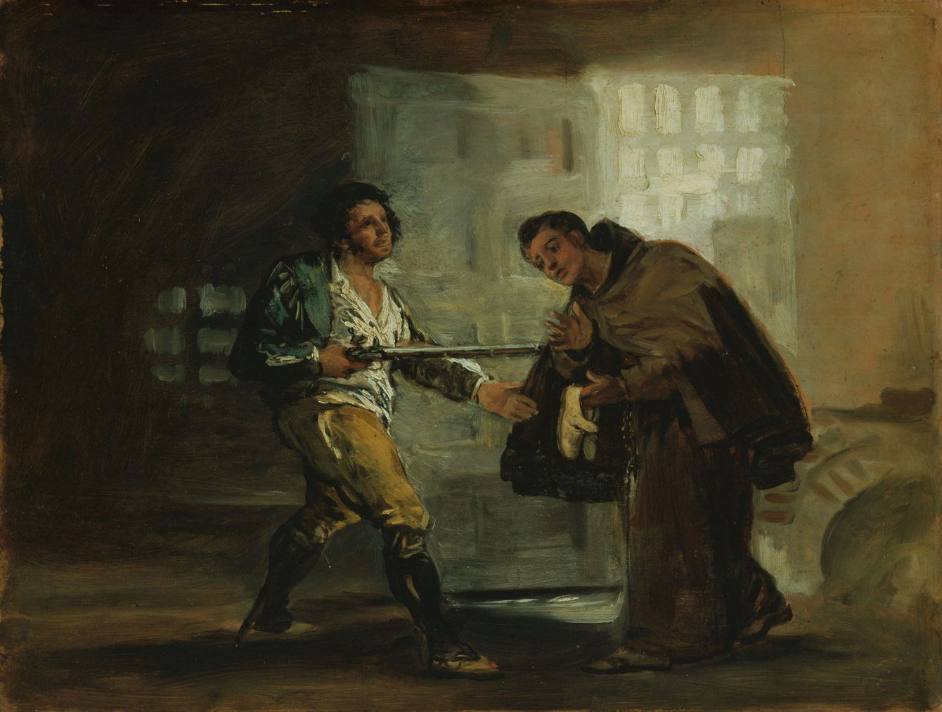 However, Goya’s most remarkable paintings of the years before the war were a series of six in which he told the story of the capture of a bandit known as El Maragato. This happened on 10 June 1806 near Oropesa to the south-west of Madrid, and it’s thought that Goya based his account on a series of contemporary prints. These six paintings on panels, now in the Art Institute of Chicago, were apparently painted for his own interest. Although not the first time in his career that he had tried reportage, his development of this narrative is of significance.